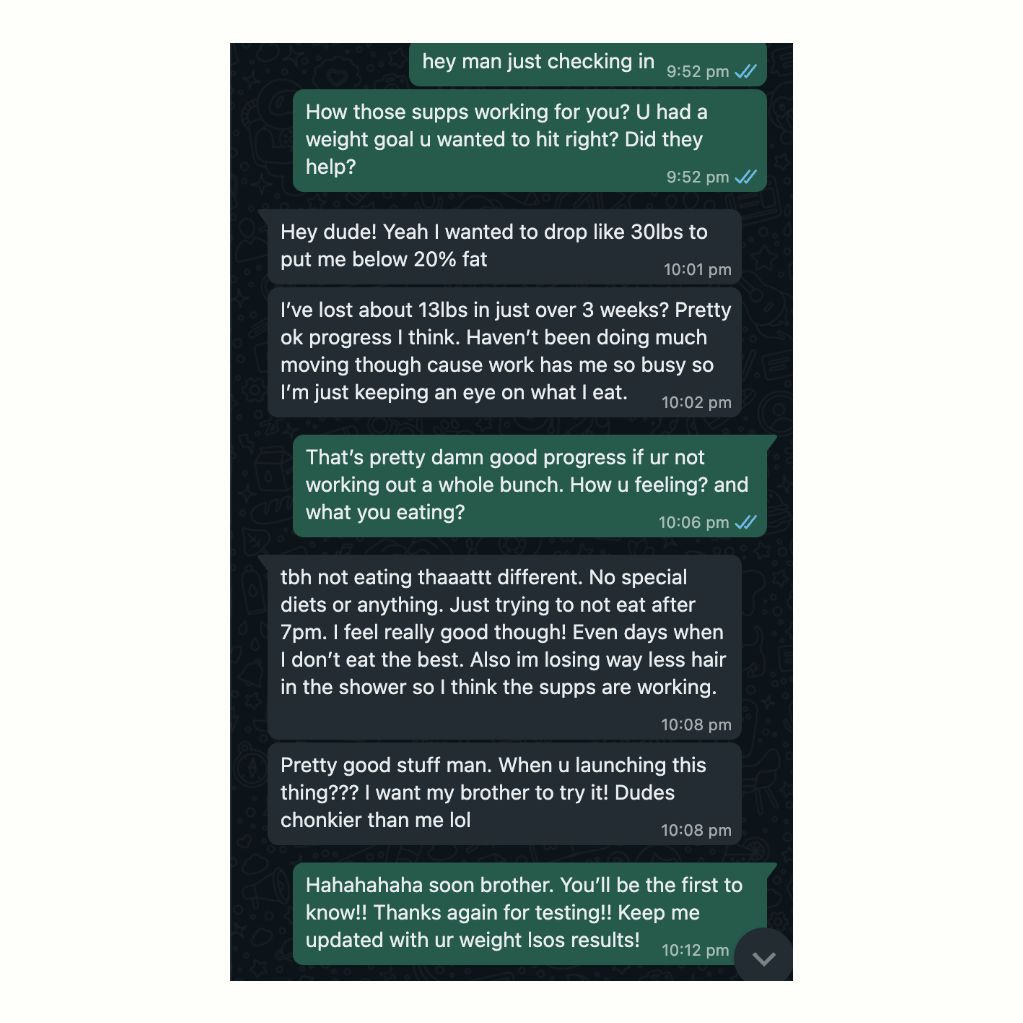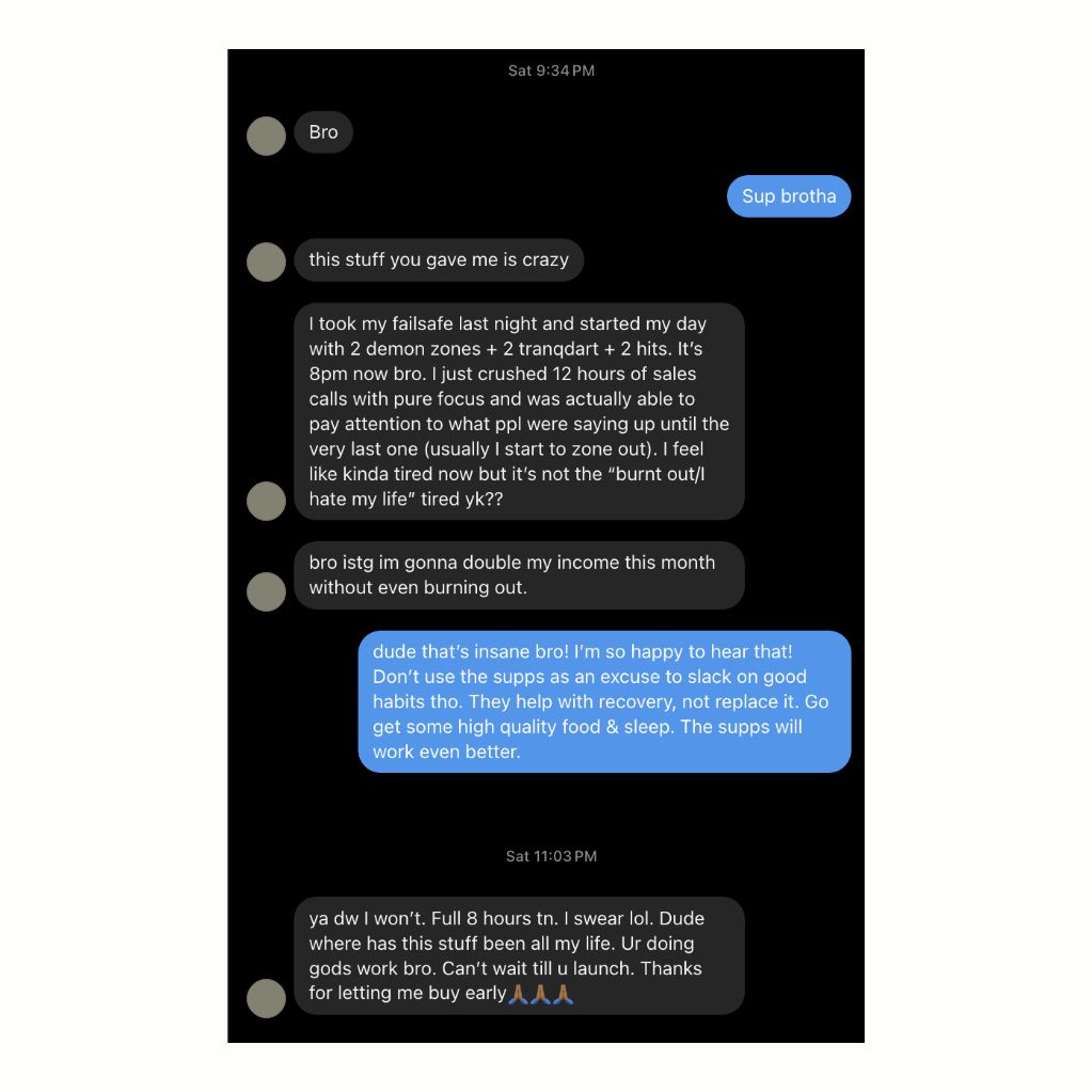 Generally, the more deficient and f*cked up your health already is, the more you’ll notice the help from our substances (cause there’s more to fix). Most users start to notice benefits within a few days to a couple of weeks of consistent use.
