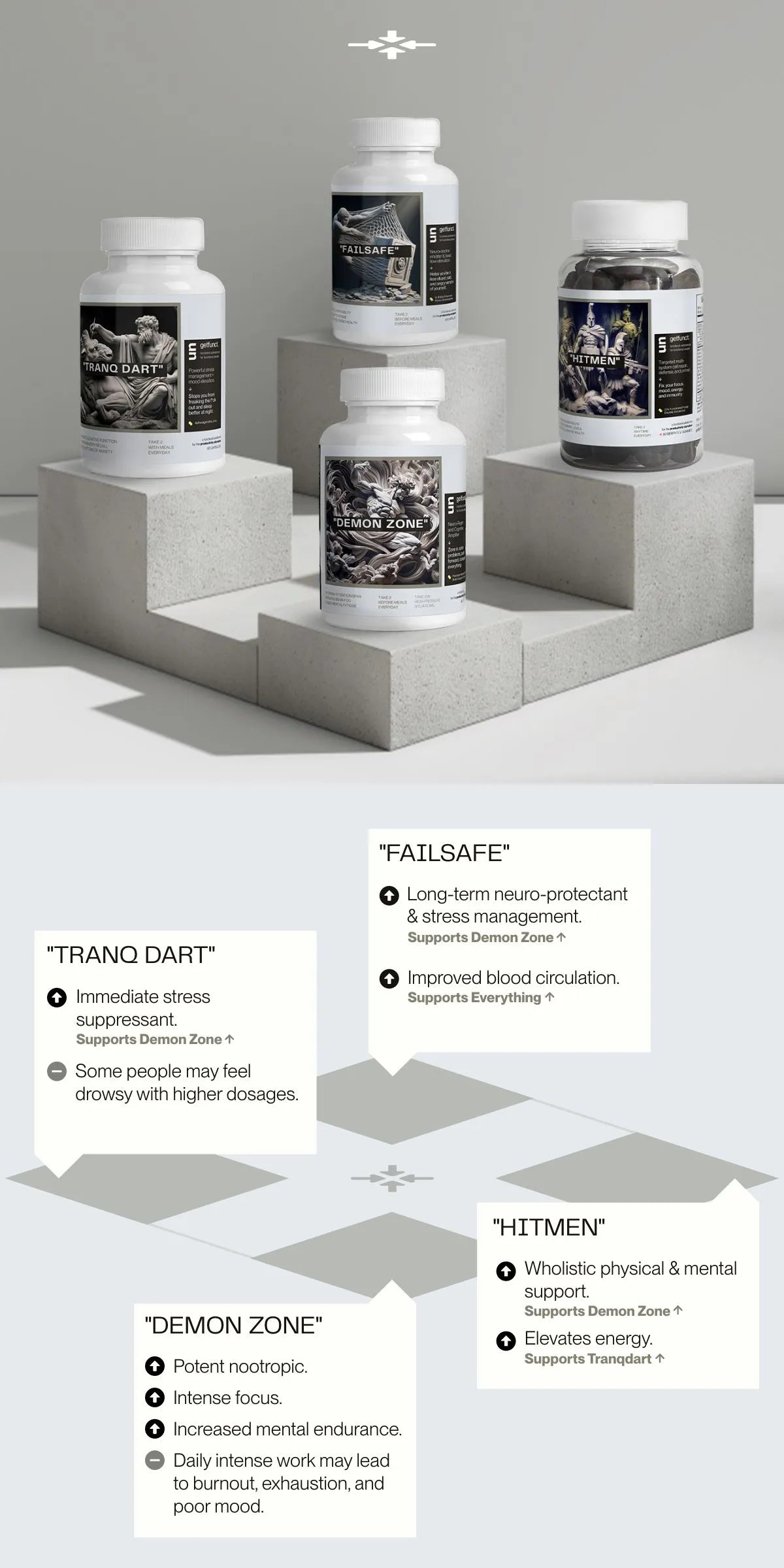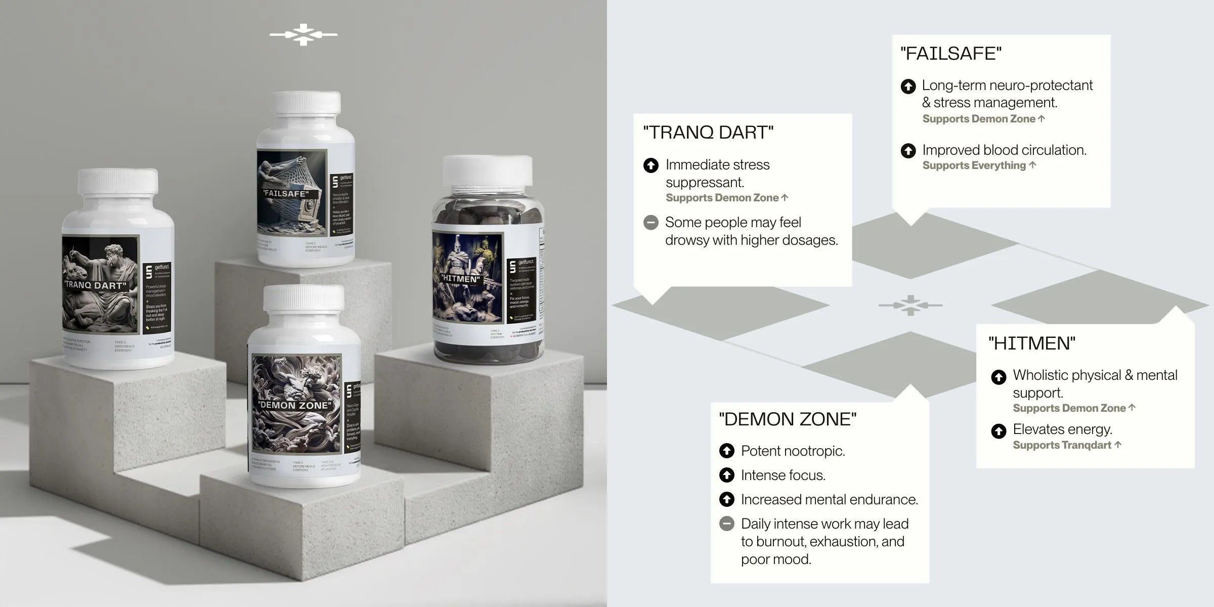 No, you have to pay extra for those. All GetFunct substances are formulated to do one specific job, and do it to perfection, nothing else. We only source high-quality ingredients that we would personally give our mothers, and therefore are generally safe for use. However, it's always best to consult with a healthcare professional before starting any new supplement regimen, especially if you have pre-existing health conditions or are taking other medications.